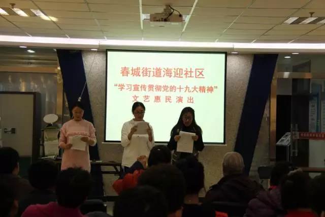 11月22日,春城街道海迎社区“新时代传习所”里座无虚席,一场“学习宣传贯彻党的十九大精神文艺惠民演出”正在进行。社区工作人员以理论宣讲、舞蹈歌曲、诗词歌赋等群众喜闻乐见的形式,推动党的十九大精神进社区,当天的活动吸引60余名社区群众到场观看。