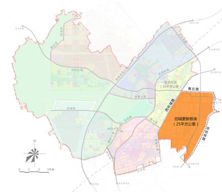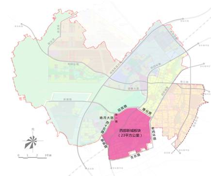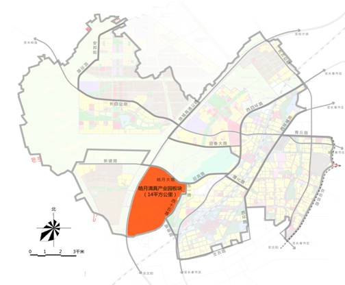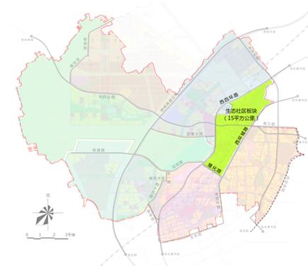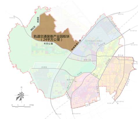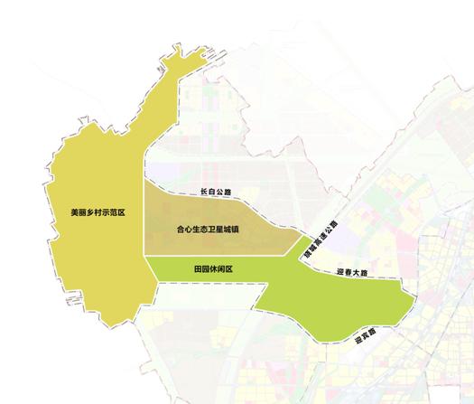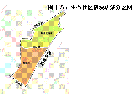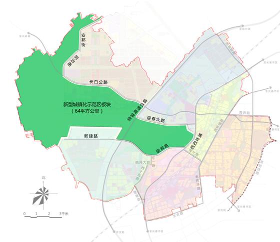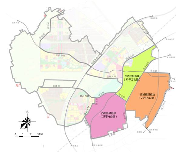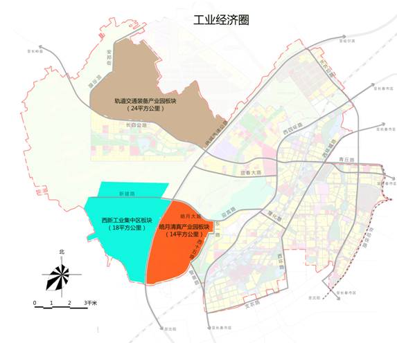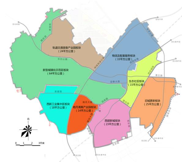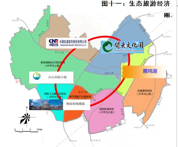 。东起绕城高速,西至绿园区界;南起绿园区界,北至规划路,面积18平方公里。规划汽车零部件产业区、精密机械产业区、产业拓展区;重点发展汽车零配件、精密机械制造。(图七、八) 由物流及配套服务板块构成,东起西四环路,西至绕城高速公路;南起迎春大路,北至长农公路,面积33平方公里。规划现代物流园区和产业转型示范区。现代物流园区重点发展服务于工业生产的汽车物流、轨道客车物流、第三方物流等生产性物流;服务于居民生活的农产品物流、冷链物流、区域性批发市场、邮政快递等生活性物流;产业转型示范区重点发展大宗材料物流等生产性物流。(图九、十)  由生态社区板块、物流及配套服务板块、轨道交通装备产业园板块、新型城镇化示范区板块、皓月清真产业园板块内的景点或景观带连贯而成。生态社区板块重点发展以雁鸣湖为核心的高端养老、养生、居住;物流及配套服务板块重点发展以关东文化园为核心的关东文化旅游休闲;轨道交通装备产业园板块重点发展轨道客车工业文化;新型城镇化示范区板块重点发展以合心湖为核心的观光体验、休闲度假;皓月清真产业园板块重点发展以皓月集团为核心的清真文化旅游。(图十一) 由西部新城板块、旧城更新板块、生态社区板块构成,区域面积63平方公里。(图十二) 西部新城板块。东起西环城路,西至西十五路;南起支农路与汽开区界线,北至迎宾路,面积23平方公里。规划活力商业区、核心交通枢纽区。活力商业区依托城市西部绿色走廊,打造高端居住和商业区;交通枢纽区重点打造交通枢纽中心,依托枢纽打造具有区域覆盖特点的商业中心。(图十三、十四) 旧城更新板块。东起京哈铁路沿线,西至西环城路;南起区界,北至青丘路,面积25平方公里。重点规划城市核心区、现代商务区、城市拓展区。城市核心区重点提升传统商贸业;现代商务区重点承接朝阳区西安大路CBD外溢的金融功能;城市拓展区重点发展大型商业和居住。(图十五、十六) 生态社区板块。东起西环城路,西至西四环路;南起隆化路,北至绿园区界,面积15 平方公里。重点规划生活区、养生度假区。生活区重点发展高端居住;养生度假区重点发展健康疗养。(图十七、十八) 由新型城镇化示范区板块构成,东起西四环路,西至绿园区界;南起迎宾路、西新工业集中区,北至长白公路、绿园区界,面积64平方公里。规划合心生态卫星城镇、田园休闲区和美丽乡村示范区三个功能区。合心生态卫星城镇重点发展城镇服务功能;田园休闲区重点发展田园观光、休闲运动、户外拓展等休闲功能;美丽乡村示范区,重点建设哈达村和新农家村2个美丽乡村社区。(图十九、二十) 表二:五大经济圈结构表 区 分 | 板块构成 | 四至范围 | 功能定位 | 重点发展方向 | 工业经济圈 | 轨道交通装备产业园板块 | 东起绕城高速,西至安邦街、同治路;南起长白公路,北至宽城界 | 打造集生产、研发、销售、检测维修、售后服务、整车物流等功能为一体的世界级轨道客车产业基地 | 重点发展整车制造、核心零部件、产品研发和配套服务业 | 皓月清真产业园板块 | 东起东一路、西十五路,西至绕城高速;南起绿园区界,北至迎宾路 | 规划食品医药健康产业区、健康产业拓展区、特色文化休闲商务区。 | 重点发展清真食品加工、生物医药及配套服务业等产业 | 西新工业集中区板块 | 东起绕城高速,西至绿园区界;南起绿园区界;北起规划路 | 规划汽车零部件产业区、精密机械产业区、产业拓展区 | 重点发展汽车零配件、精密机械制造 | 物流经济圈 | 物流及配套服务板块 | 东起西四环路,西至绕城高速公路;南起迎春大路,北至长农公路 | 规划现代物流园区和产业转型示范区 | 重点发展服务于工业生产的汽车物流、轨道客车物流、大宗材料物流、第三方物流等生产性物流;服务于居民生活的农产品物流、冷链物流、区域性批发市场、邮政快递等生活性物流 | 生态旅游经济圈 | 生态社区板块、物流及配套服务板块、轨道交通装备产业园板块、新型城镇化示范区板块、皓月清真产业园板块内的景点或景观带连贯而成 | | 打造集高端养老产业、关东文化休闲旅游、轨道客车工业文化、清真文化、现代农村观光度假为一体的特色绿园游 | 生态社区板块重点发展以雁鸣湖为核心的高端养老、养生、居住;物流及配套服务板块重点发展以关东文化园为核心的关东文化旅游休闲;轨道客车装备产业园板块重点发展轨道客车工业文化;新型城镇化示范区板块重点发展以合心湖为核心的观光体验、休闲度假;皓月清真产业园板块重点发展以皓月集团为核心的清真文化旅游 | 城市商业经济圈 | 西部新城板块 | 东起西环城路,西至西十五路;南起支农路与汽开区界线,北至迎宾路 | 规划活力商业区、核心交通枢纽区 | 活力商业区依托城市西部绿色走廊,打造高端居住和商业区;交通枢纽区重点打造交通枢纽中心,依托枢纽打造具有区域覆盖特点的商业中心 | 旧城更新板块 | 东起京哈铁路沿线,西至西环城路;南起区界,北至青丘路 | 规划城市核心区、现代商务区、城市拓展区 | 城市核心区重点提升传统商贸业;现代商务区重点承接朝阳区西安大路CBD外溢的金融功能;城市拓展区重点发展大型商业和居住 | 生态社区板块 | 东起西环城路,西至西四环路;南起隆化路,北至绿园区界 | 规