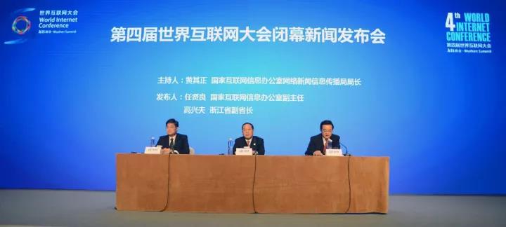 第四届世界互联网大会5日举行大会闭幕新闻发布会,国家互联网信息办公室副主任任贤良、浙江省副省长高兴夫出席并通报大会取得的重要成果。